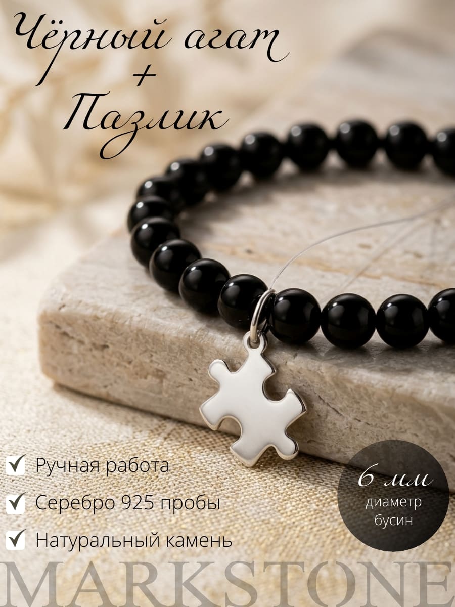 Откройте для себя украшение, в котором мистическая глубина натурального камня соединяется с утончённым дизайном. Браслет из Чёрного агата с серебряной подвеской «Пазлик» — это не просто аксессуар, а талисман с характером, способный дополнить любой образ и подчеркнуть индивидуальность.
