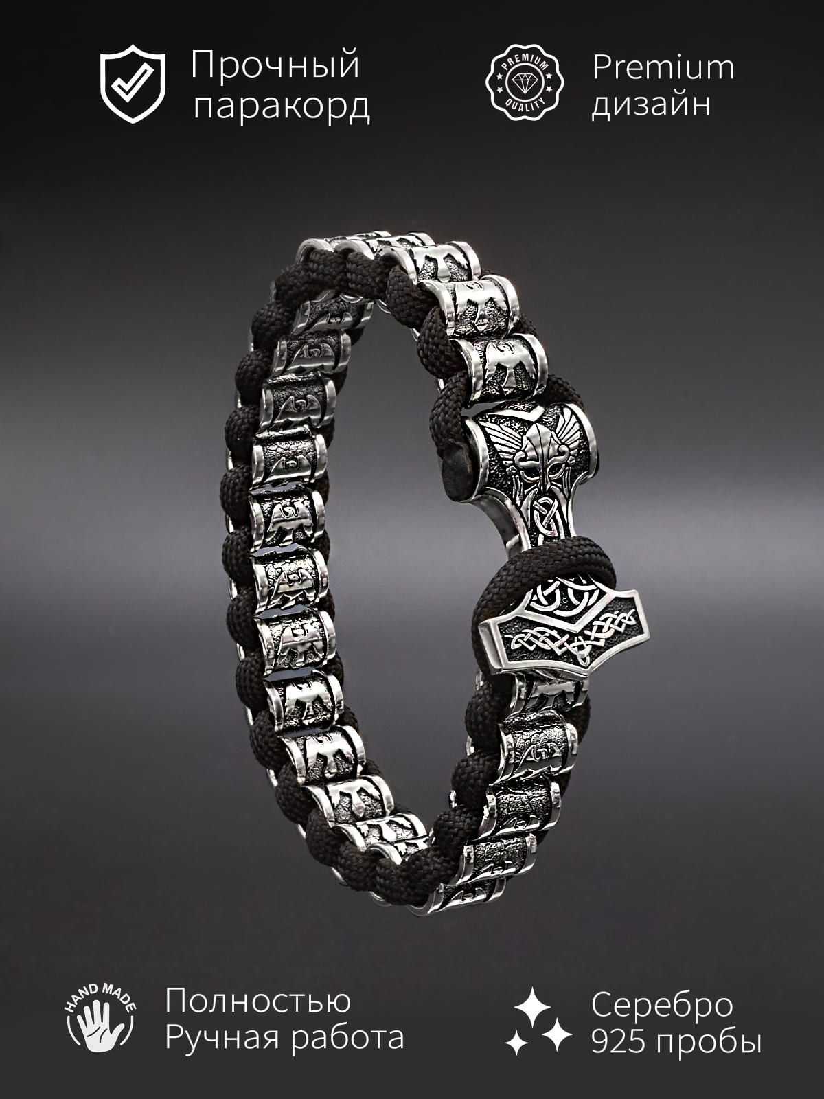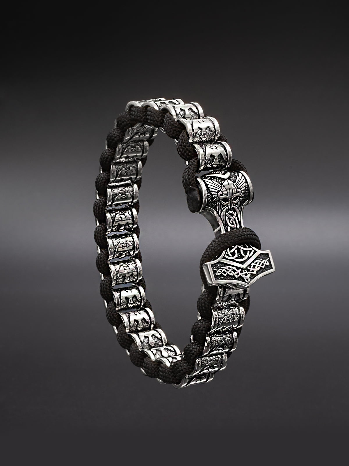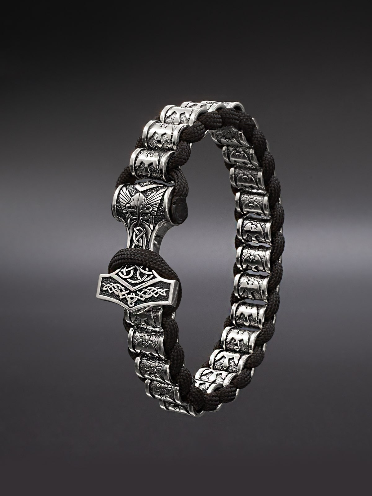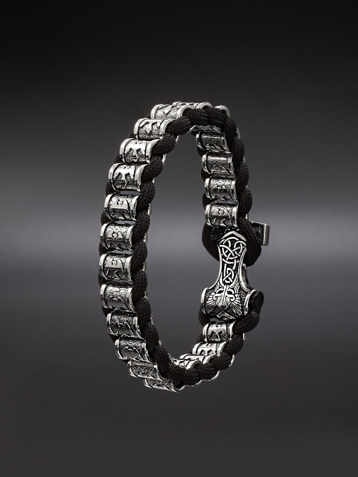 Браслет, где сходятся мифология Севера и ювелирное мастерство. Изделие из серебра 925 пробы дополнено застёжкой в виде Мьёльнира — символа силы и защиты в скандинавской традиции.