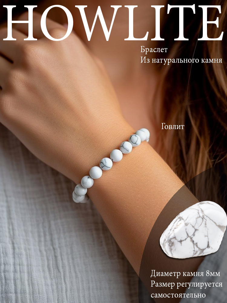 Наша классическая коллекция браслетов из натурального Говлита для Женщин и девушек, в основе браслета лежит ювелирная нить, она легко тянется и имеет высокую прочность, что позволяет надевать и снимать его каждый день. Диаметр камней 8 мм.