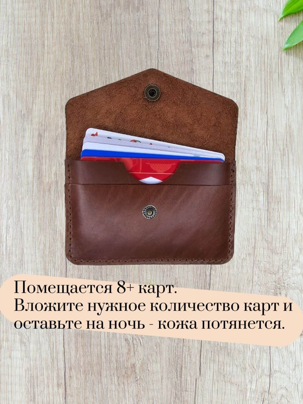 - вмещает до 8 карт (за счёт свойства растяжения натуральной кожи при приложении длительного усилия, Вы можете увеличить этот объем, поместив в картхолдер несколько карт и оставив на сутки, натуральная кожа потянется под требуемое количество);