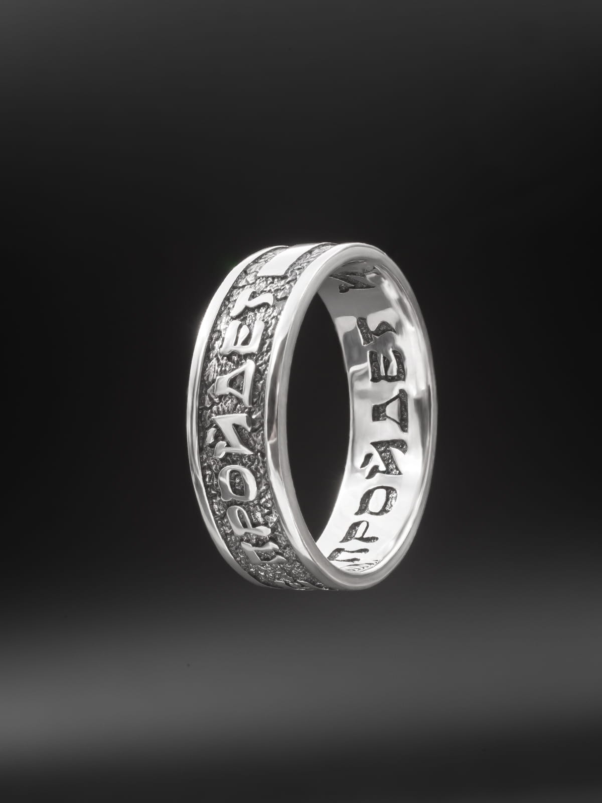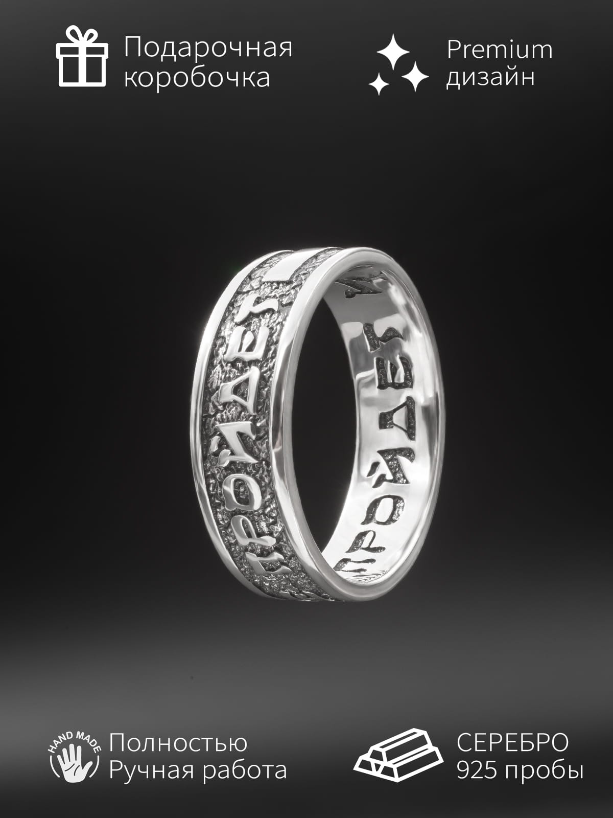 - Выпуклая внешняя надпись привлекает взгляд, играет со светом и тенью, подчёркивая главный посыл кольца.