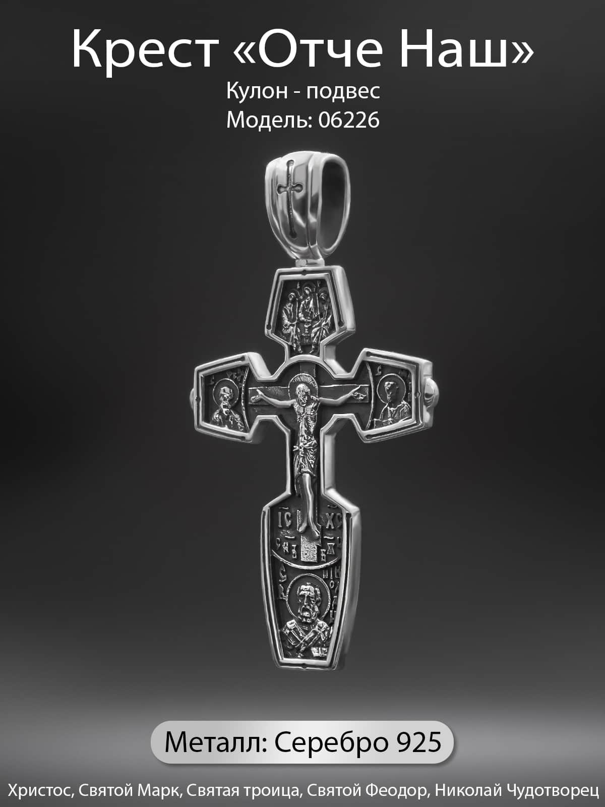Модель 06225: На обоих сторонах креста, располагаются лики святых. Христос, Богородица, Святой Марк, Святой Феодор, Святой Георгий, Апостол Андрей и Николай Чудотворец. Размеры креста, можете посмотреть в фотографиях.