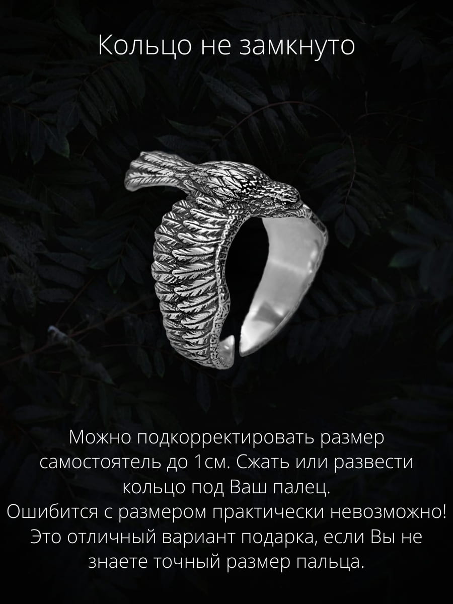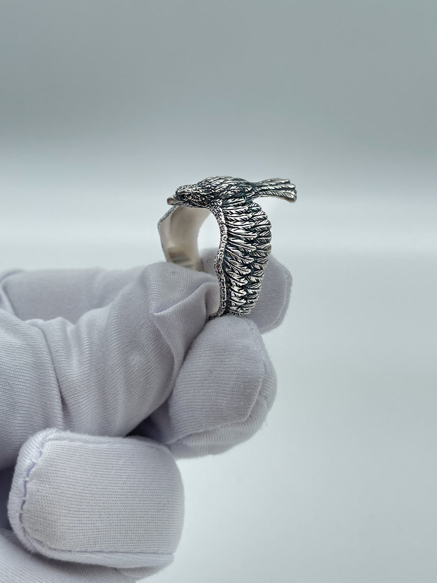 Мощное и изящное кольцо в виде Орла из серебра 925 пробы — украшение для тех, кто ценит символы силы, свободы и лидерства. Уникальная конструкция с крыльями, охватывающими палец, создаёт эффект настоящего полёта и подчёркивает индивидуальность владельца.