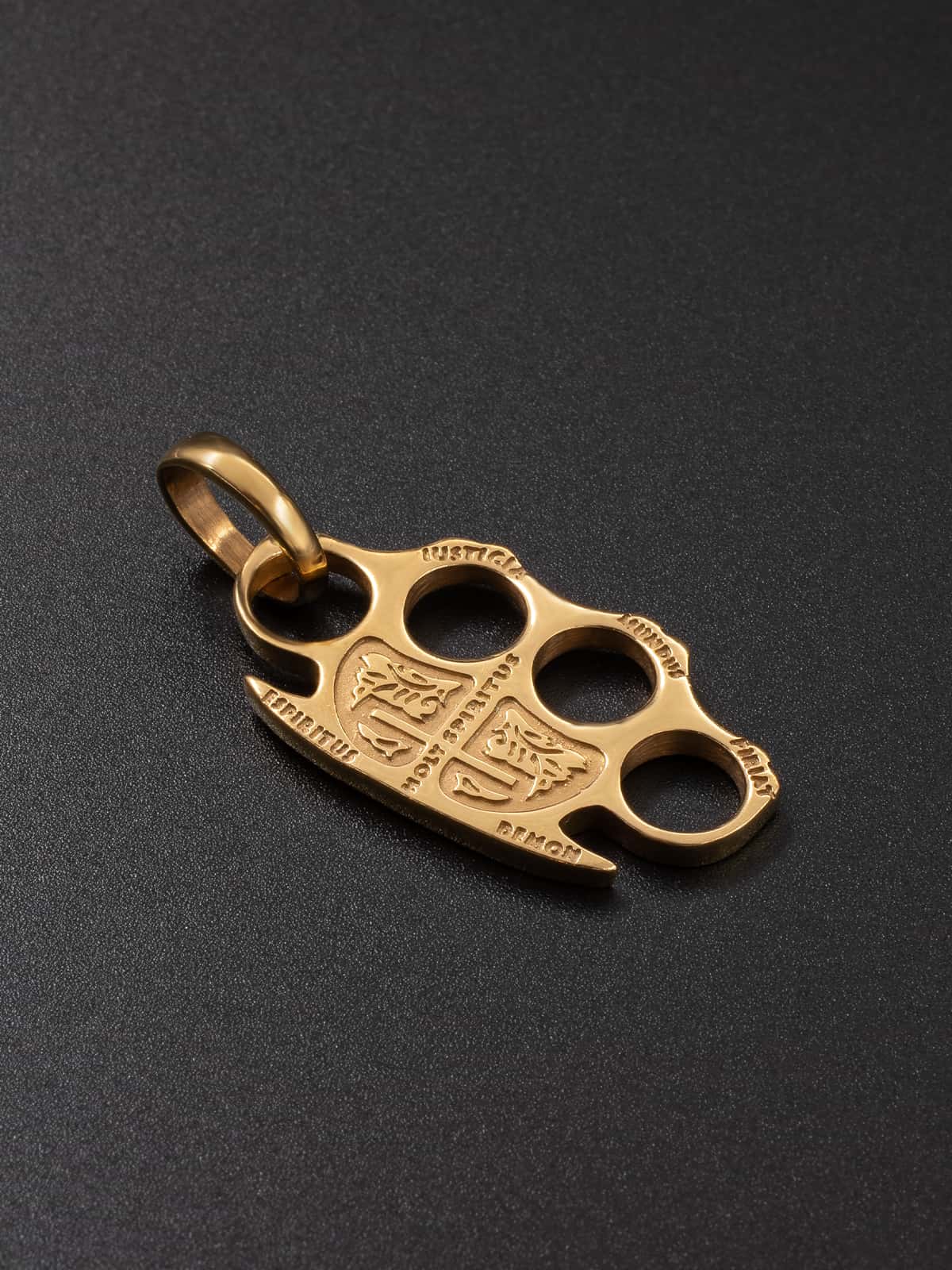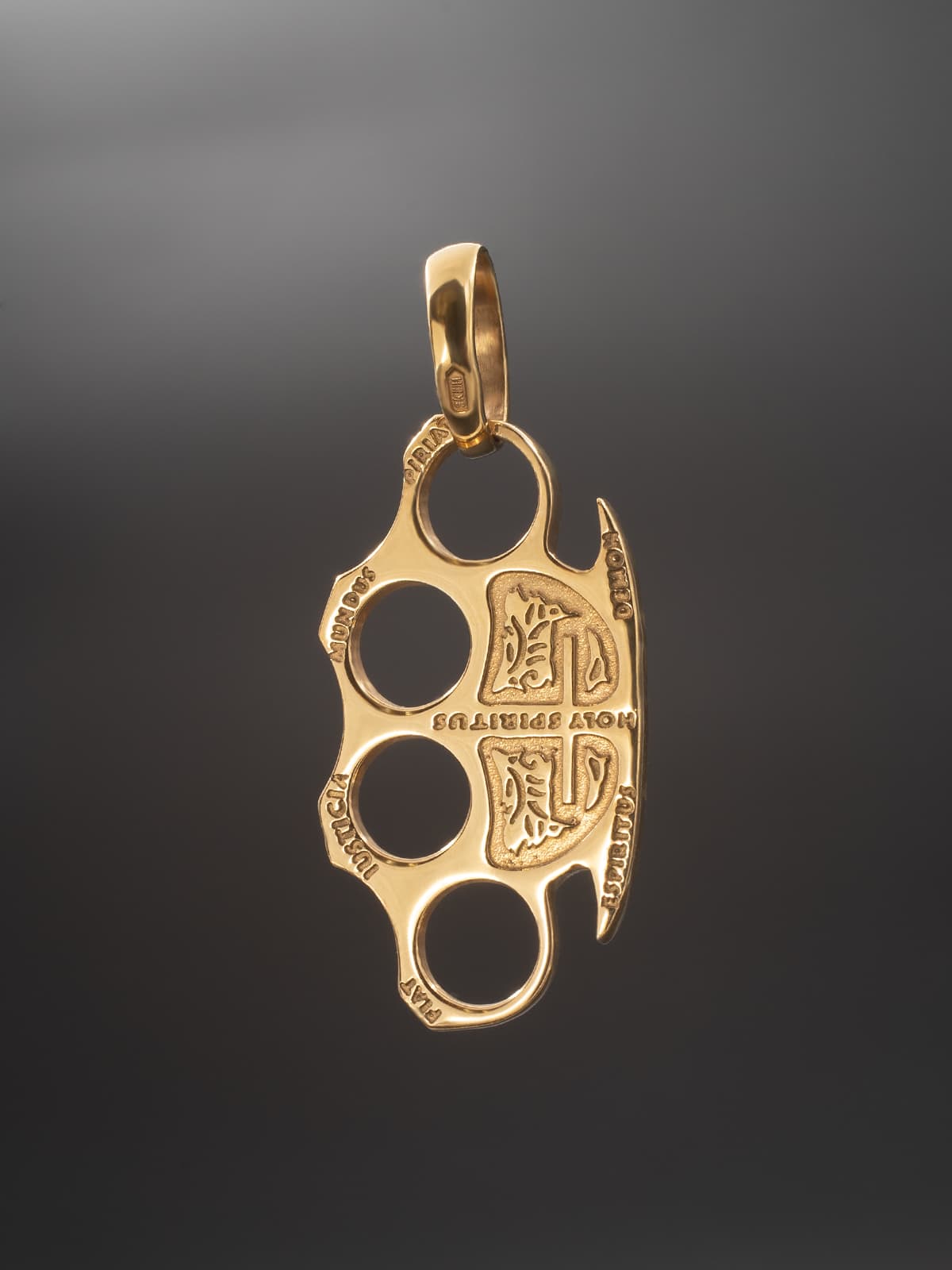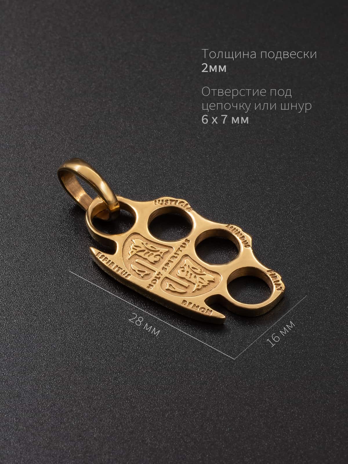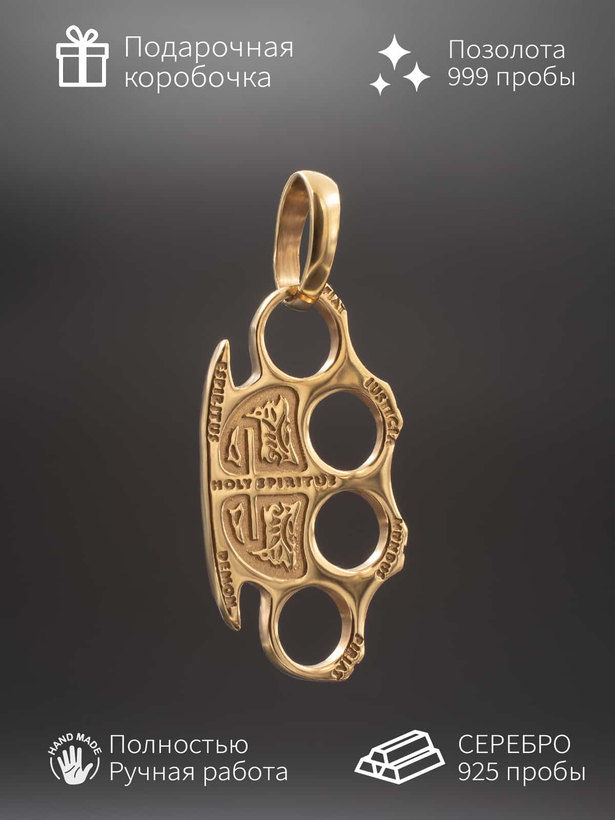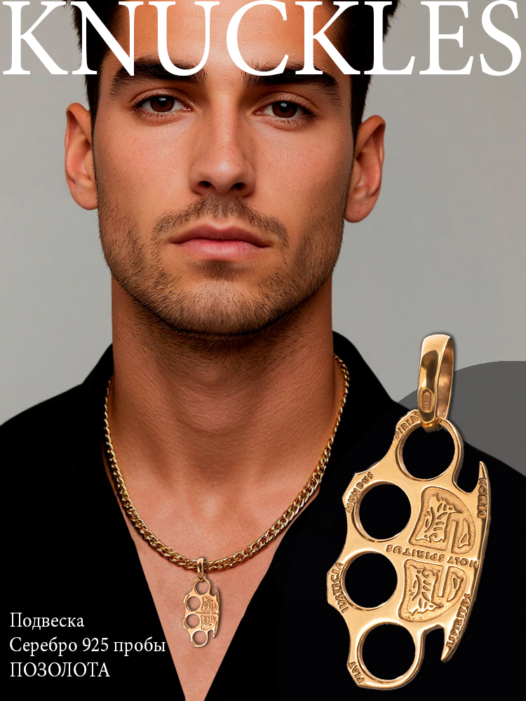 Кулон-подвес из позолоты имеет яркий и запоминающийся вид с изображением кастета, который символизирует силу, решительность и защиту. Он красиво выполнен в золотых тонах, что делает его еще более привлекательным и эффектным аксессуаром.